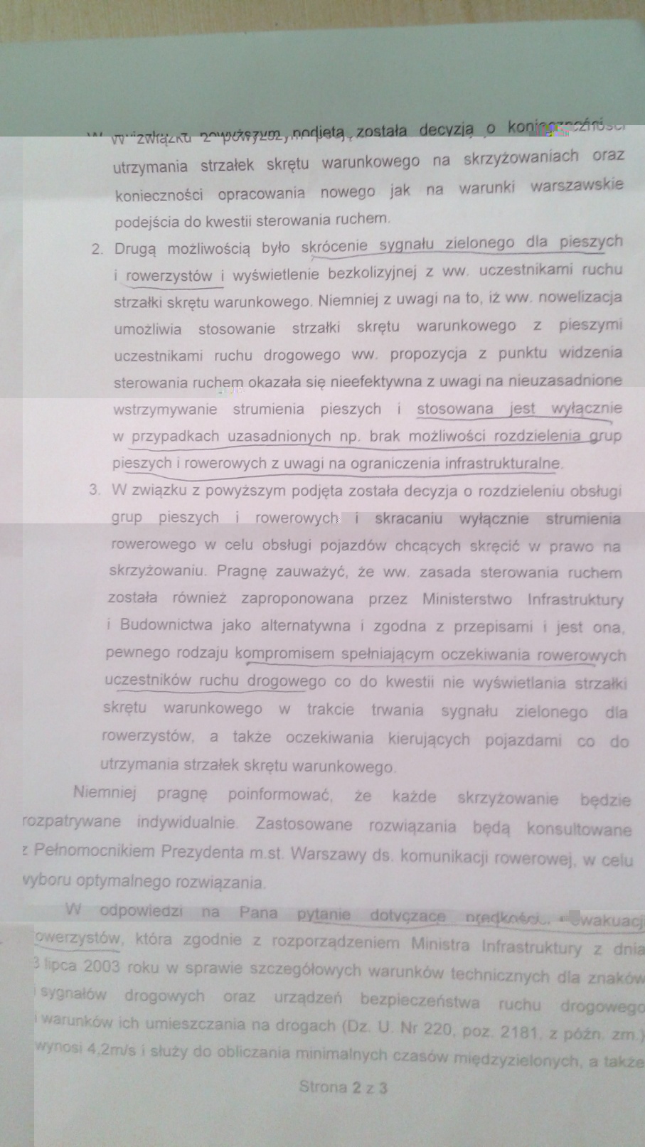 4) W kwestii uwzględnia wyższej prędkości ewakuacji rowerzysty do opóźnienia zakończenia zielonego wymijająca odpowiedź: „Pragnę zauważyć, że wartości minimalnych czasów międzyzielonych służą wyłącznie do zapewnienia bezpieczeństwa uczestnikom ruchu drogowego poprzez odpowiednie odseparowanie w czasie kolizyjnych strumieni ruchu.” Konkretnych deklaracji brak.