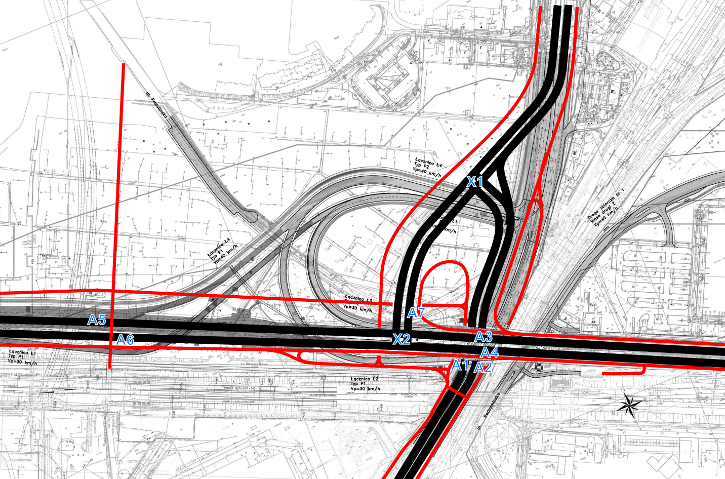 Wszystkie jezdnie 2x2, można zrobić 2x3 na odcinku łącznicowym, gdzie skumuluje się trochę więcej ruchu. W szczególności al. Solidarności pod wiaduktem kolejowym zamiast 2x3 + jednostronny ciąg pieszo-rowerowy powinna mieć 2x2 + obustronne ddr + chodniki.