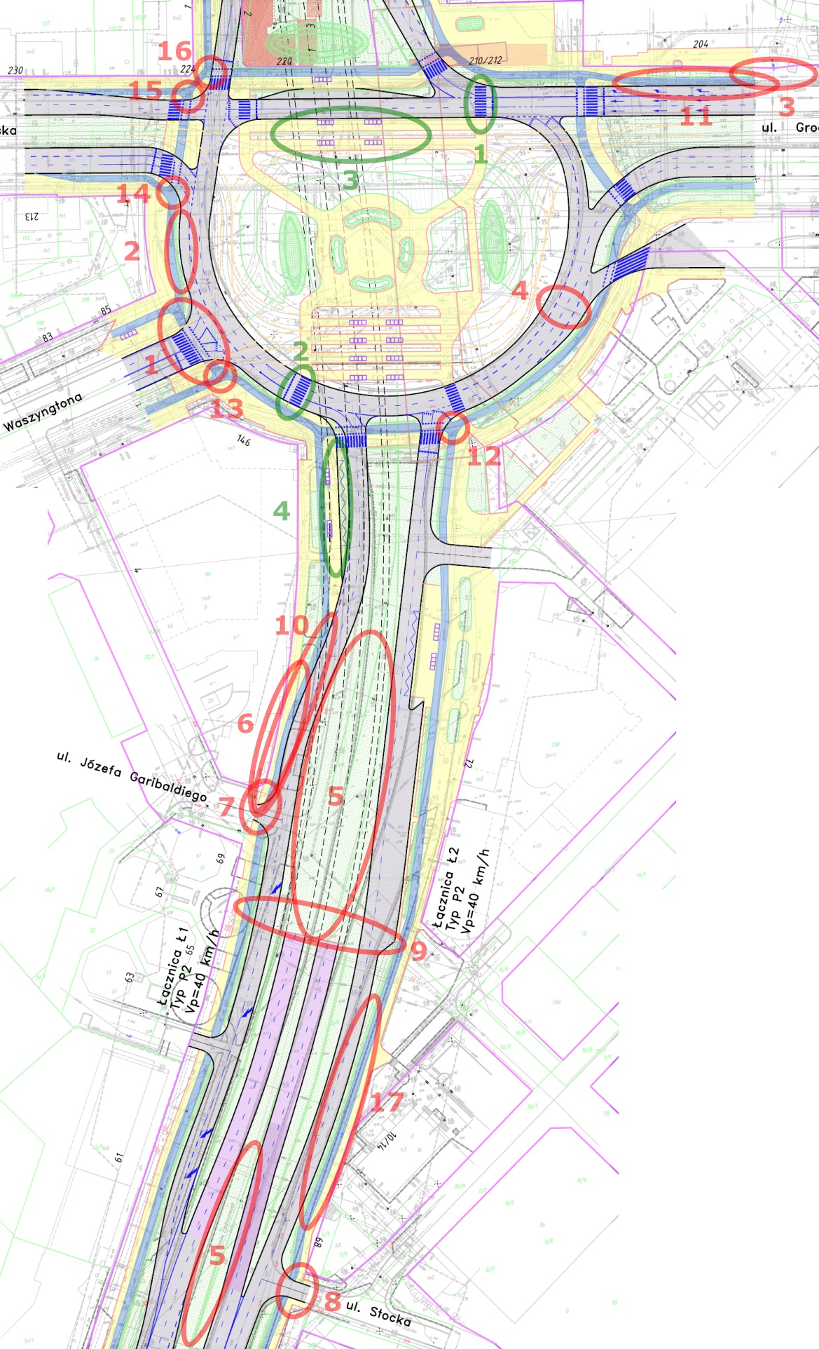 1, 2. Dodatkowe przejścia dla pieszych na środek ronda.